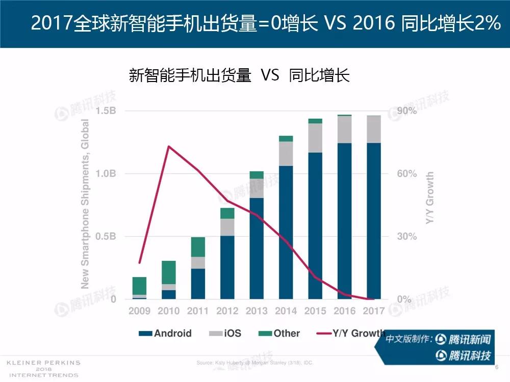 2017年是智能手机出货量首次未能实现增长的一年。随着全球智能手机用户数量越来越多,用户增长也变得越来越困难。互联网用户的增长也面临着相同的趋势,2017年增长率为7%,低于上年的12%。随着全球网络用户已超过全球人口的一半以上,尚未接入互联网的人口变得越来越少。
