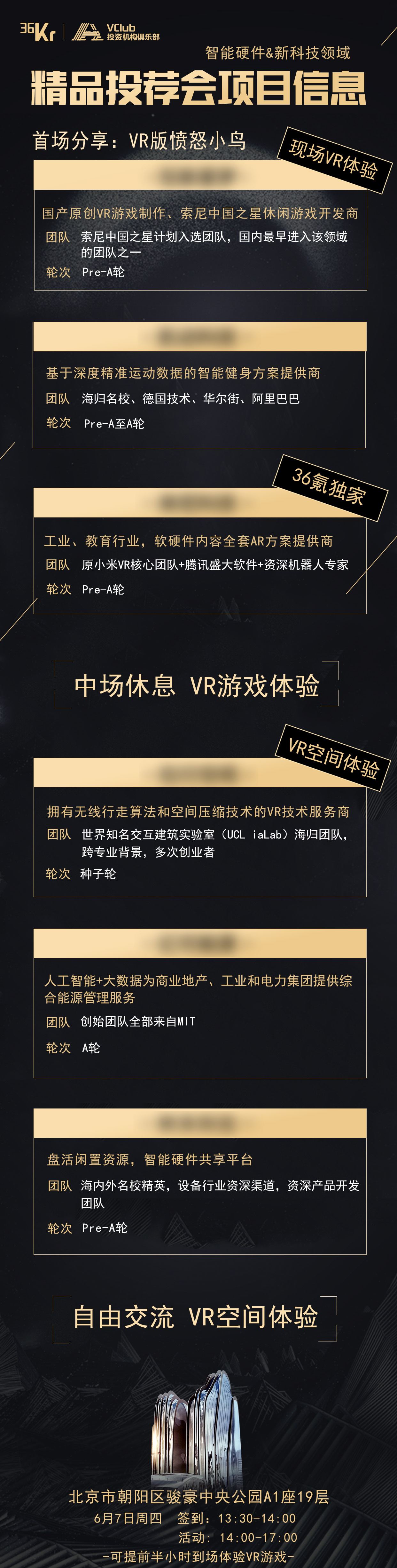 6月7日我们将举办第二期“精品投荐会”,本期精投荐会聚焦智能硬件与新科技领域,精心筛选6个优质项目,覆盖36氪独家项目、首次曝光项目及多位项目负责人将带设备到现场带来沉浸式VR体验。我们将在投荐会结束后提供优质的沟通环境,让交流变得绝对高效。