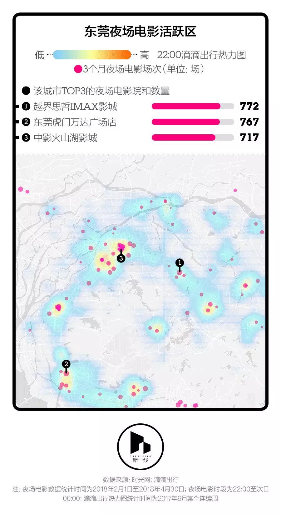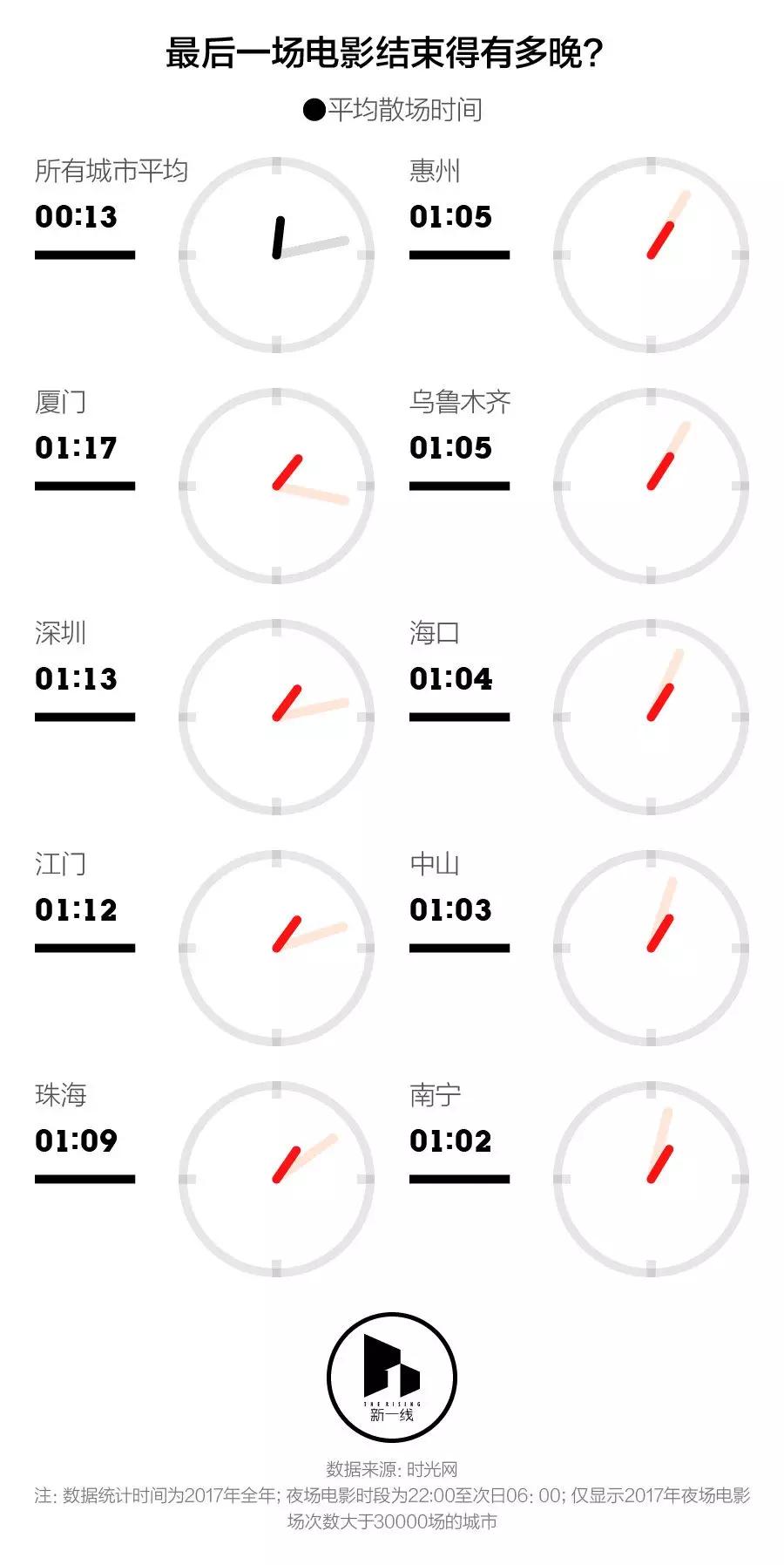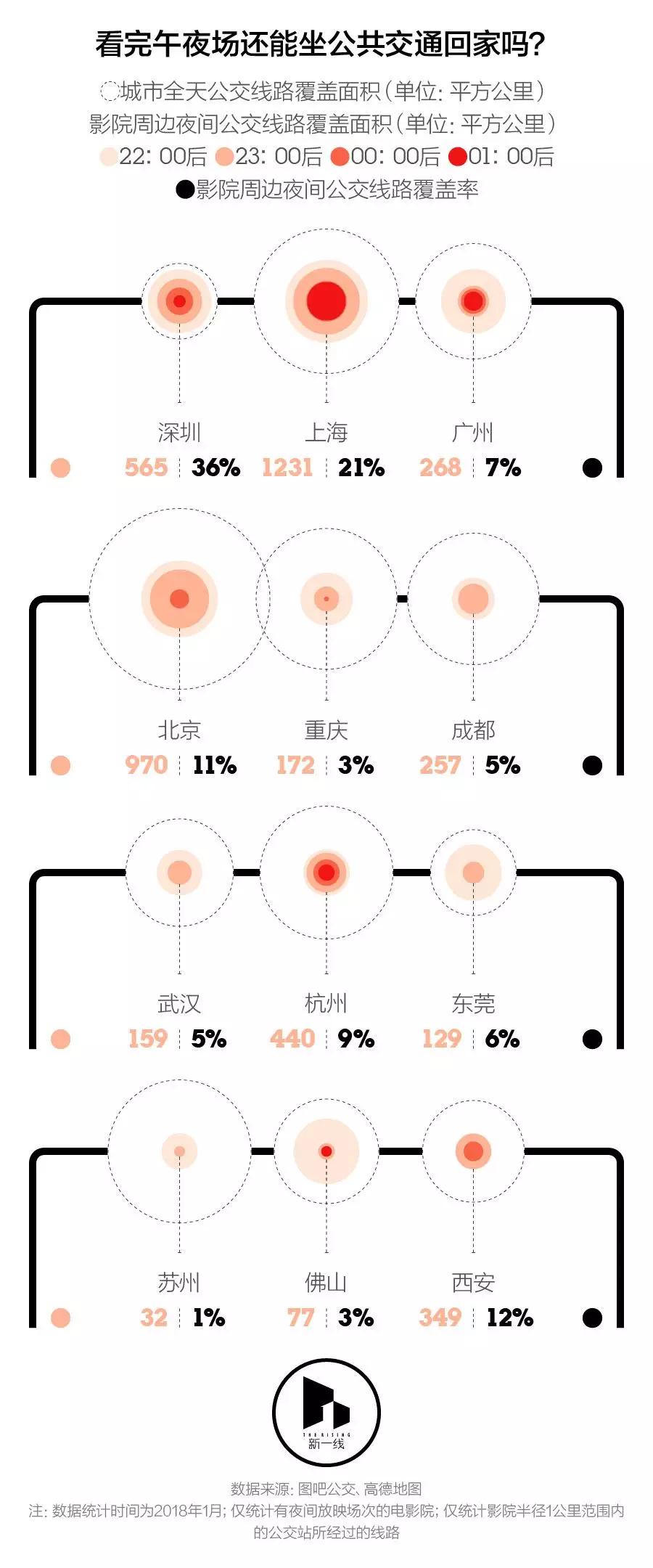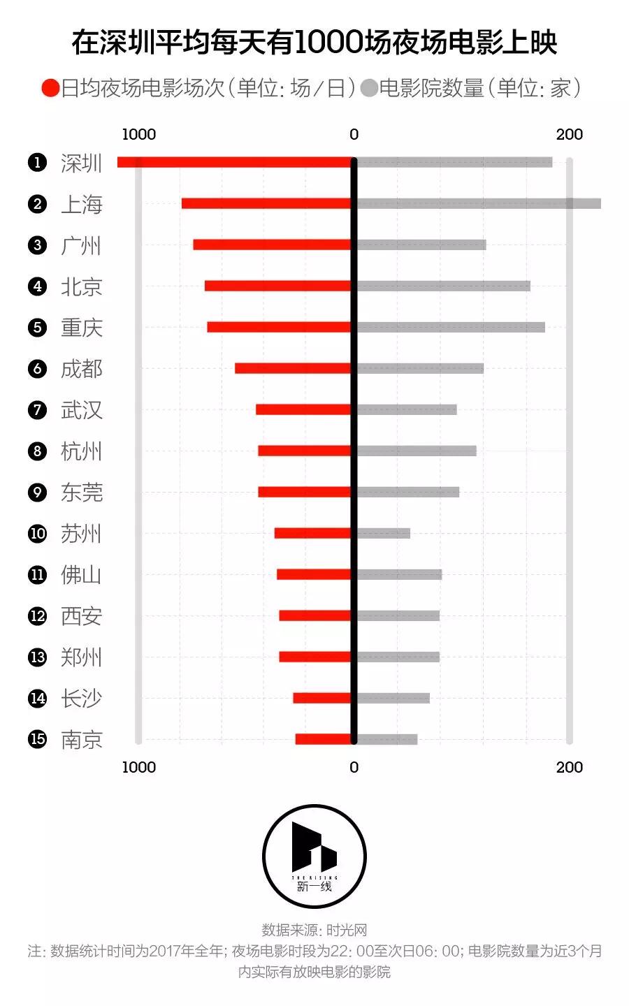 从结果看,遗憾的是,如果你生活在重庆、成都、武汉、东莞或苏州,你几乎找不到0点之后还能坐公交回家的电影院——重庆、成都和武汉还是新一线城市中2017年度夜场电影最多的城市。