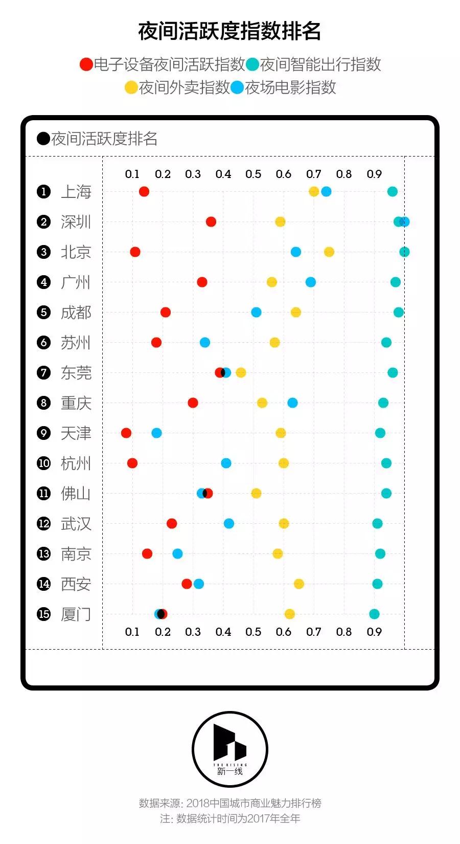 在一个月前发布的《2018中国城市商业魅力排行榜》中,新一酱综合了夜间公共交通、夜场电影指数、电子设备夜间活跃度、夜间智能出行指数、夜间外卖指数和夜间灯光指数等个维度,试图以城市在夜晚持续供给的服务设施、商业空间和每个城市人在夜间的行为数据来评价城市的夜间活跃度。在这一指标中,华东和华南城市的夜间活跃度整体较高,而成都、苏州、东莞则是新一线城市中排名最高的城市。