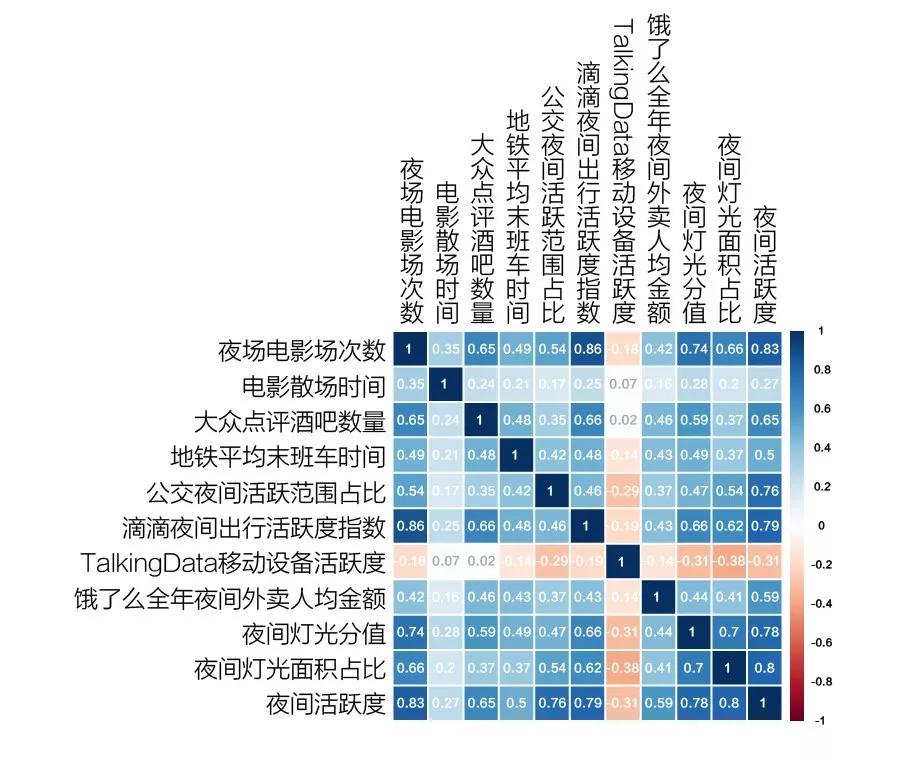 新一酱尝试寻找夜场电影场次数与夜间活跃度指数中其他维度变量的相关关系。其中滴滴夜间出行活跃度与夜场电影场次数两个变量的Spearman相关系数为0.86,呈高度正相关,其检验p值为2.2×10-16,显著相关(p值≤0.05意味着在假设检验在统计学意义上具有显著性)。