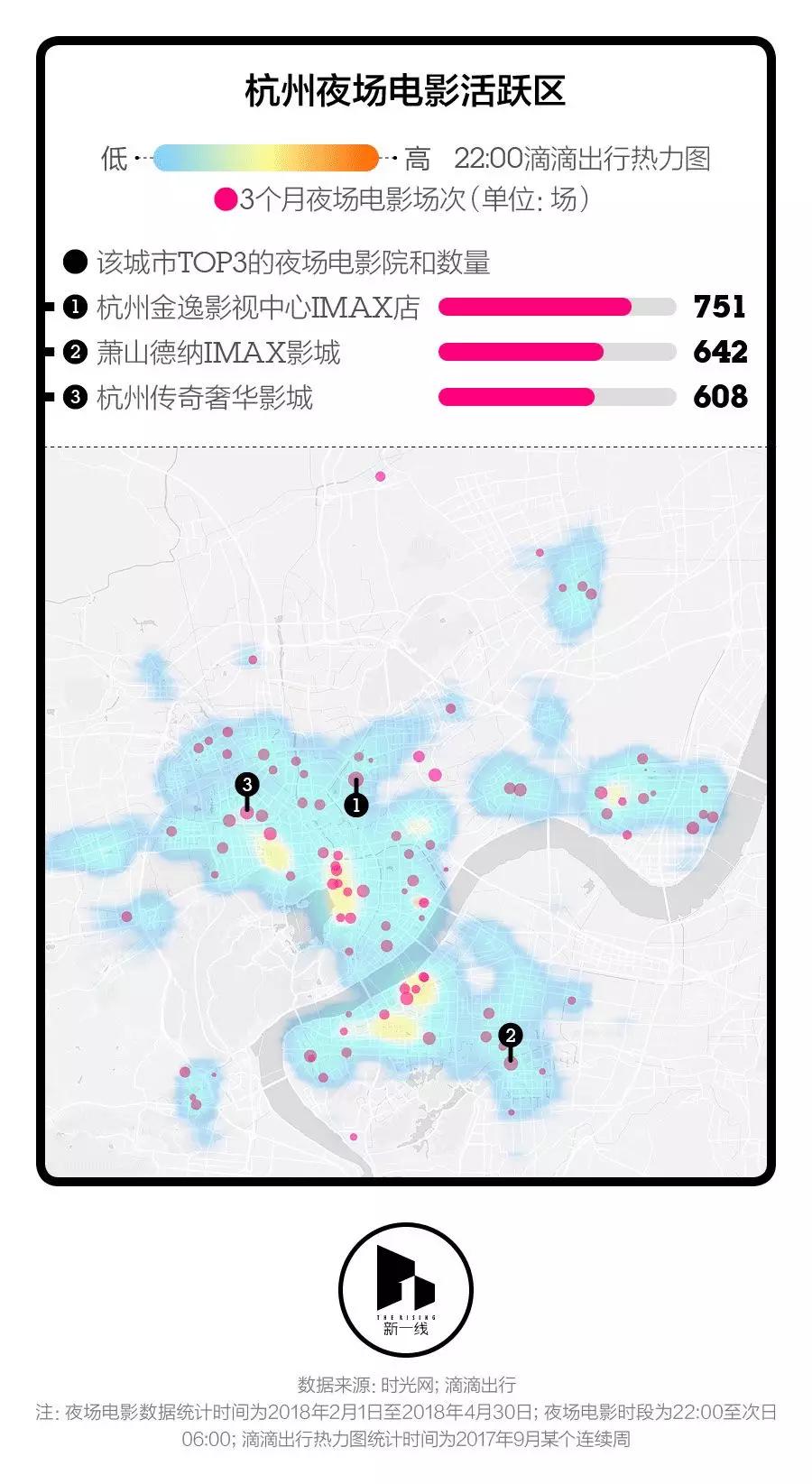 不过上图的这些重合并不意味着“散场后从电影院打车回家”的夜间出行热度就一定高。通常来说,电影院都布局在城市中重要的商业区,到了午夜,周边也还有夜间餐饮、酒吧、KTV或其他娱乐场所在活跃。上面提到的综合出行数据更多能反映的是一座城市整体的夜间活跃区域。
