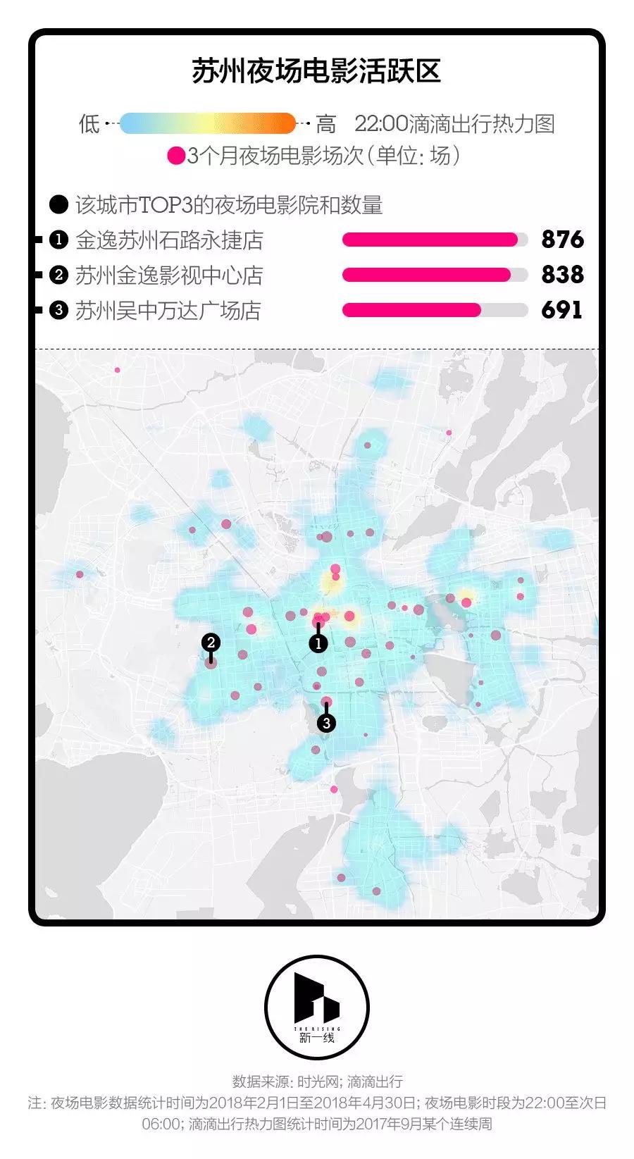 杭州和苏州则还有一些滴滴的夜间出行热点区域中并没有夜场电影出现,它们之中包含了一些大规模创新企业聚集区或者说加班热点区,也有一些是交通枢纽。