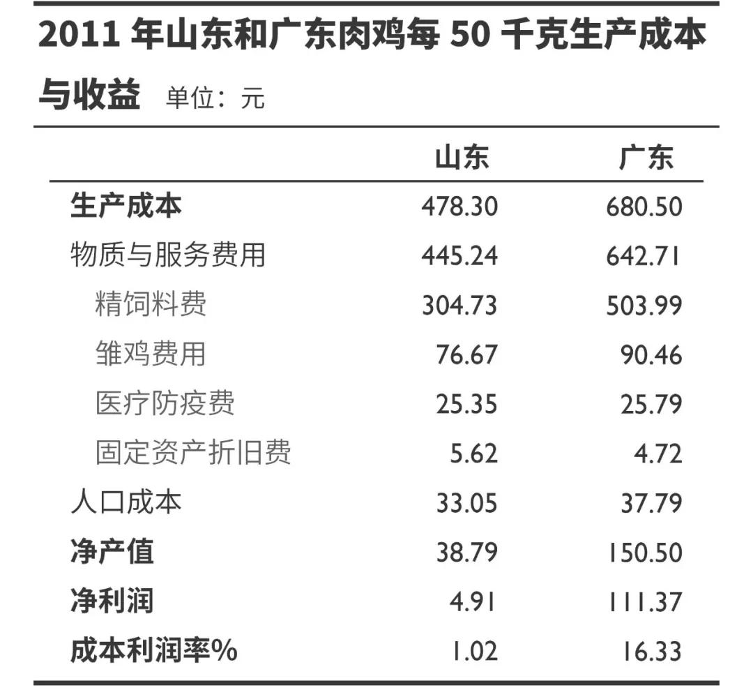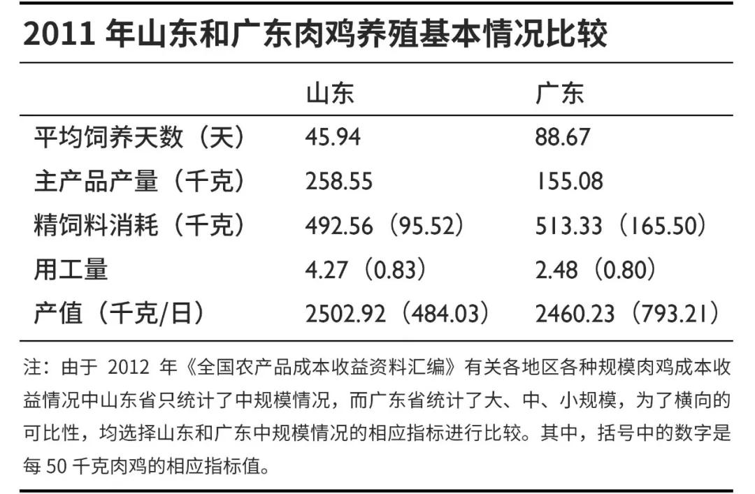 看下面这张表。典型白羽鸡阵营的山东和典型黄羽鸡阵营的广东,在平均饲养天数和相同饲养规模鸡肉产量上的差别,就是南北鸡肉品质差异最直接的证明。