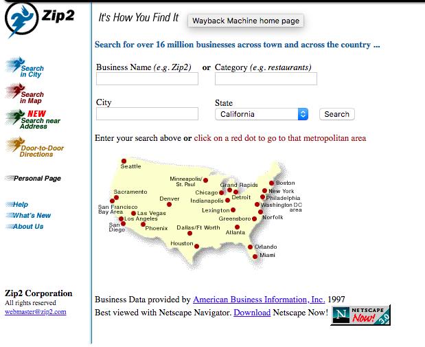 1997年,Zip2.com网站的网页截图。