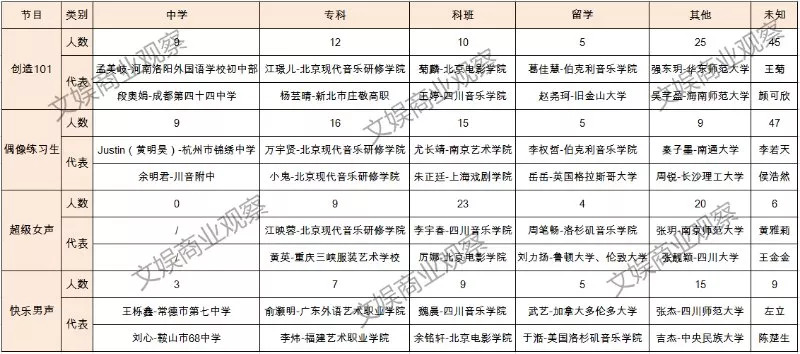 在这个看脸的时代,学历无疑是个加分项。而相比于《快乐男声》《超级女声》,《创造101》和《偶像练习生》的学历又有哪些变化?快来看看,你pick的小姐姐、小哥哥到底是不是学霸。