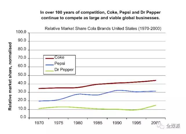 “一旦网络引力开始在某个行业中发挥作用,互联网的特性就保证了那些作用非同小可。社会化的、全球化的以及数字化的食物往往呈现滚雪球式的增长态势。”而这与线下市场有着根本性的区别。举例来看,在碳酸饮料行业,全球领军者是可口可乐,挑战者是百事可乐, 两家公司竞争了大半个世纪,每年砸下数十亿美元的广告费,大量聪明绝顶的人为此付出巨大的努力,但事实上两家公司的市场份额并没有太大的变化。