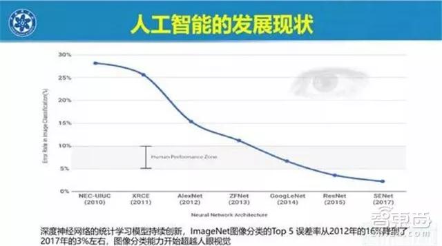 因为深度学习的涌现,大家可以从曲线看到,用于图像分类的标识人工智能或者深度学习识别力已经低于人的错误率,也就是说识别力高于人。包括跟环境的交互,找出最好策略,这就是所谓强化学习。以及我们经常讲魔高一尺道高一丈,在博弈中学习,使得学习能力不断提高,这就是生成对抗学习。