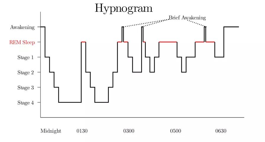 图中,横坐标表示持续时间,纵坐标表示睡眠深度,越往下睡眠越深。标红的地方属于REM,stage 1-2 属于浅度睡眠,stage 3-4 属于深度睡眠。