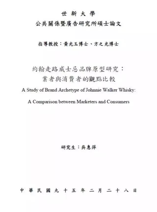 2012年,我在网上搜索品牌相关心理学知识时,无意之中找到台湾著名传播院校世新大学的一篇硕士论文——《约翰走路威士忌品牌原型研究》。