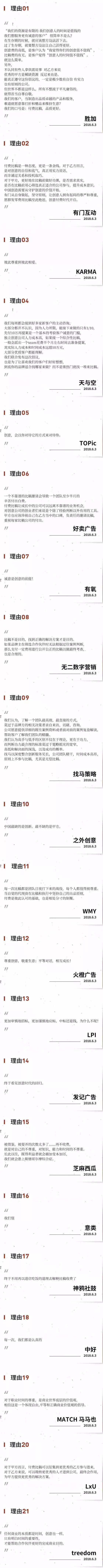 乙方或者丙方公司都有同一个梦想:先保证生存,再考虑尊严。所以,除了这21家,还有大把乙方或者丙方不会或者暂时不会收取创意费,但创意未必差,尤其是丙方,你以为乙方的活儿都是自己干的吗?层层外包早就是行业的潜规则。所以,寻找靠谱的供应商,永远是甲方需要做的事,但并不代表这21家收费的创意就是最好的,只能说他们都很自信,确实有不少牛人。