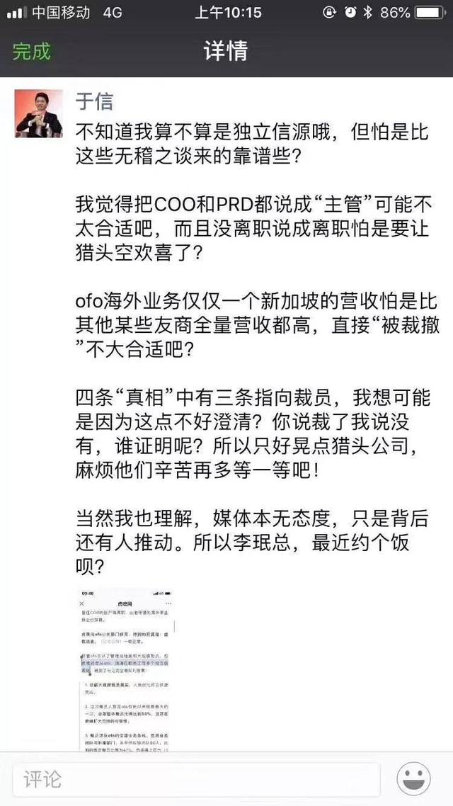 ofo联合创始人于信在朋友圈对此新闻进行了回应,表示相关消息是无稽之谈、背后有人推动。很多公司在面对对公司不利的传言时,要么不回应,要么态度强硬地回应——既然是谣言自然应该追究造谣和传谣者责任,否则就很没底气。而于信态度却很温和,甚至想要跟这家媒体的负责人约饭,从这一点可以猜测,对应的报道或许有出入,但不是凭空想象:ofo正在收缩或者说优化。