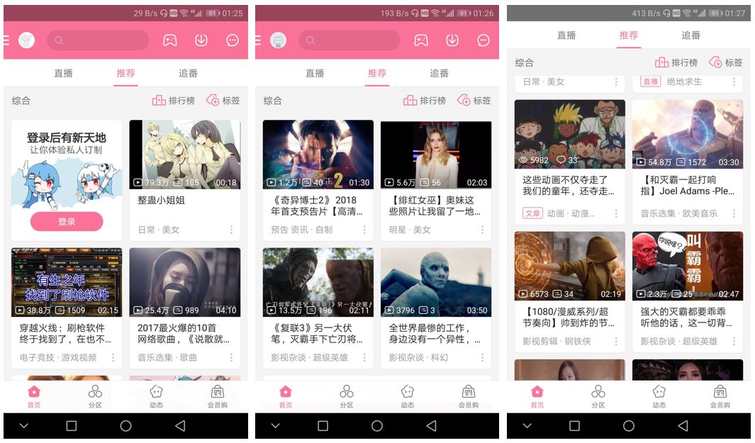上图为登录哔哩哔哩弹幕视频网前后的差距截图,第一张截图是没有登录的时候,会提示让用户登录并说明登录后有新天地让用户体验私人订制。第二张截图以及第三张截图都是登录之后的样子,可以看出内容有了明显的变化。