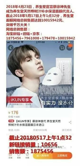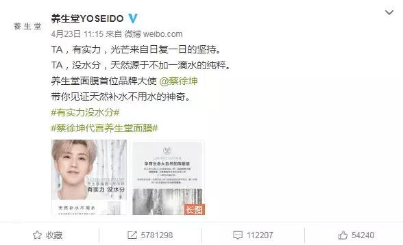 出道之后他个人接到的第一个代言是养生堂面膜,自4月23日官宣之后,养生堂微博转赞评数超过500万,对比此前的微博,这个数据就是突飞猛进,一下午销售额突破200万,25天的时间销售额突破千万,粉丝强大的购买力和消费力让品牌商赚得盆满钵满,而且让大家看到蔡徐坤这个新晋偶像影响力超群,商业号召力一呼百应。