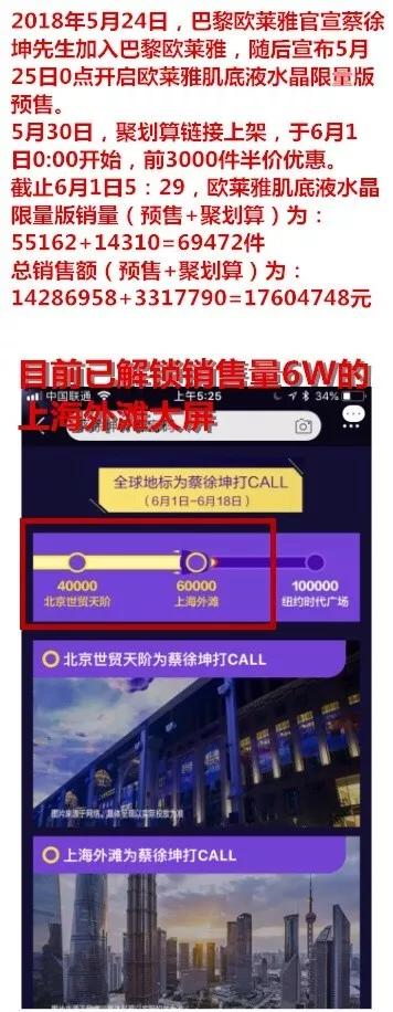 养生堂面膜的成功案例,让巴黎欧莱雅也有了底气,给259元一瓶的水晶限量版小黑瓶定出了10万的目标。截止6月1日的预定数是69472件,总销售额为17604748元。不知在618前,IKUN能否在路人们的协助下,完成品牌给金牌销售蔡徐坤制定的这个挑战粉丝经济天花板的极限销售任务。