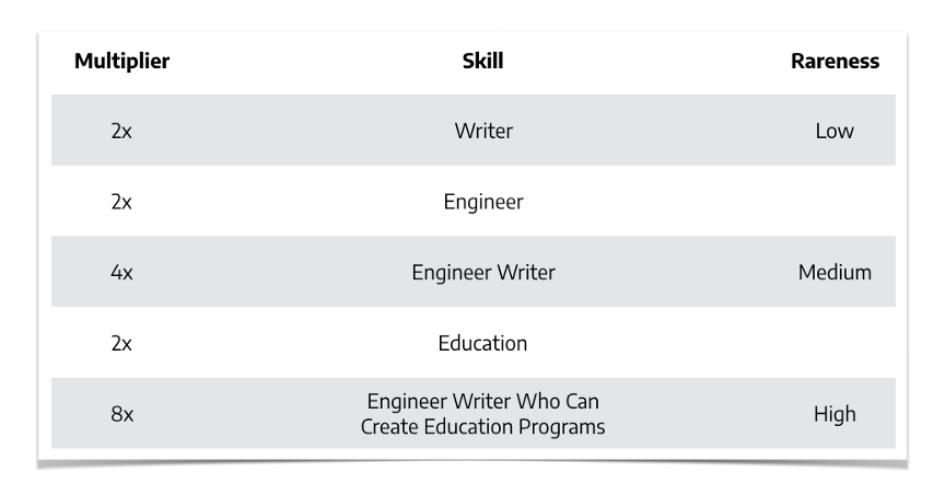 接着安德烈森举了一个工程师的例子,他同时也是一名作家,在教育领域的知识也非常渊博。这些技能的每一种都很常见,但是当你把它们结合在一起时,你会得到越来越多罕见且有价值的技能: