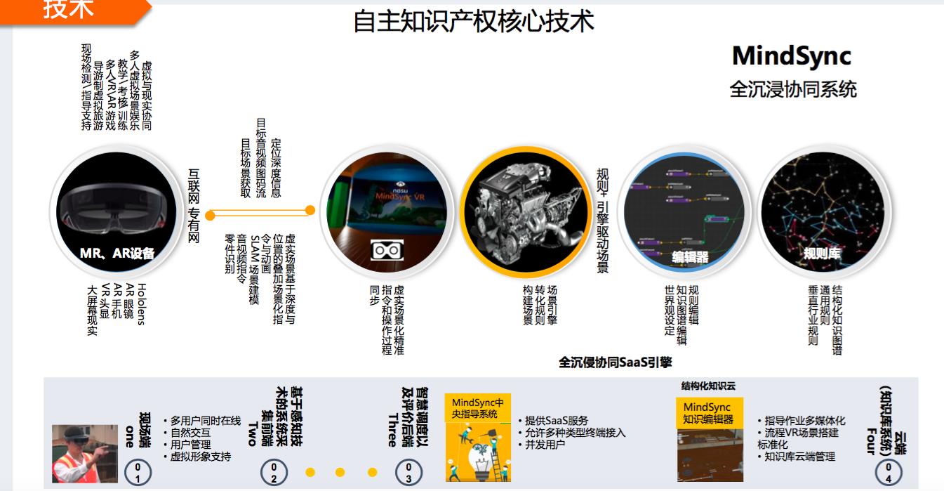与市面上做VR影视内容的CP相比,在内容制作方面,纳虚光影开发了一套名为MindSync的全沉浸协同系统。 目前这套系统已经完成了基础功能的开发,主要用于解决VR、AR场景中的交流、协作问题,可以简单理解成内含了PPT功能的VR版Skype引擎,在引擎的基础上,叠加不同的场景和物体,结合云端的SaaS服务,就可以实现面向不同用途的VR多人远程协作应用。