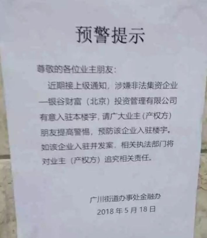 5月18日,东方银谷旗下品牌“银谷财富”被荣成市防范和处置非法集资工作领导小组办公室点名,列入在该市涉嫌违规从事相关金融业务名单。