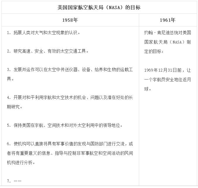 以上是美国国家航空航天局(NASA)1958年和1961年的目标,很明显,1961年的目标清晰得多。