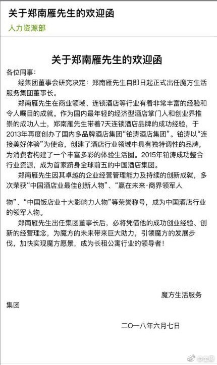36氪讯,6月7日,魔方生活服务集团发布通知称,经集团董事会研究决定,铂涛酒店集团创始人郑南雁正式出任魔方生活服务集团董事长。