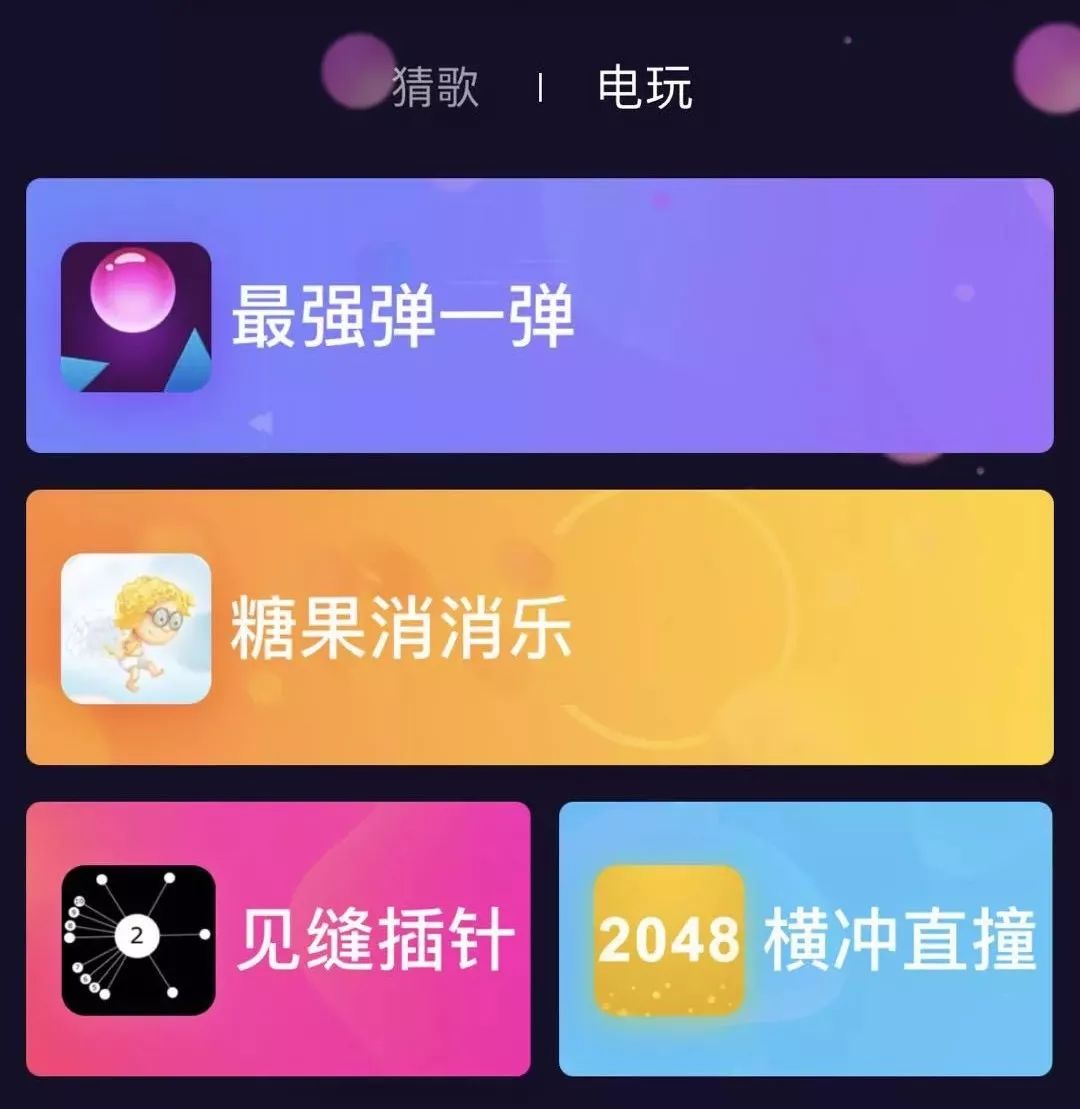 或许是吸取了直播答题除答题外其他时间平台活跃度趋于零的教训,前几天今日歌王版本更新新增了电玩板块,实际上就是最近热门游戏小程序集锦,如“最强弹一弹”、“糖果消消乐”、“2048横冲直撞”,让这类易操作的中毒小游戏填补用户答题后的空虚。