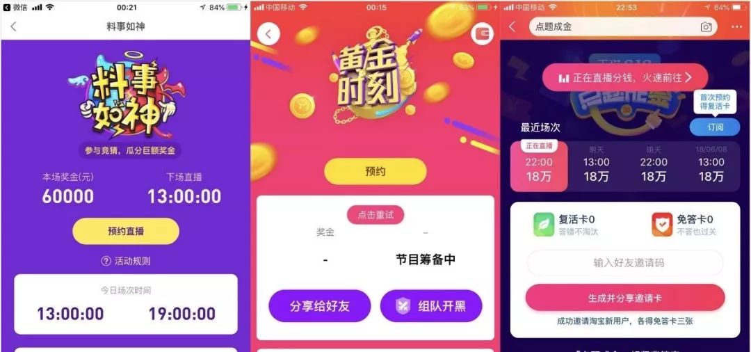 加上被唱衰的直播答题,总有种要“死灰复燃”的既视感。最近花椒直播第二季答题“料事如神”已上线,一直播的黄金十秒改为独立App黄金时刻,淘宝也内嵌了点题成金直播答题功能。