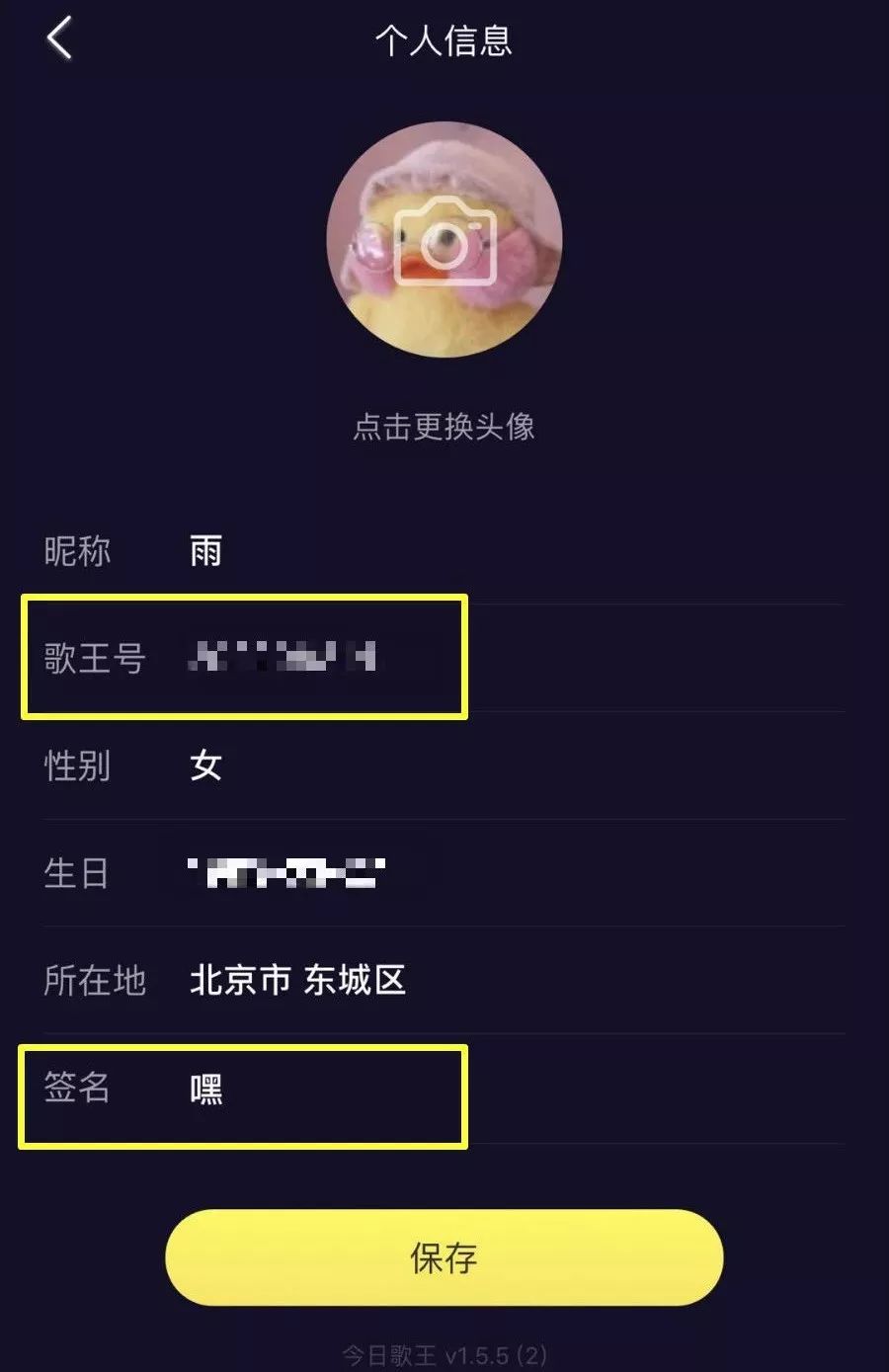 点击头像打开个人信息,可以看到“歌王号”、“签名”两个信息栏,如果仅仅是答题App这两块设计似乎有点多余。