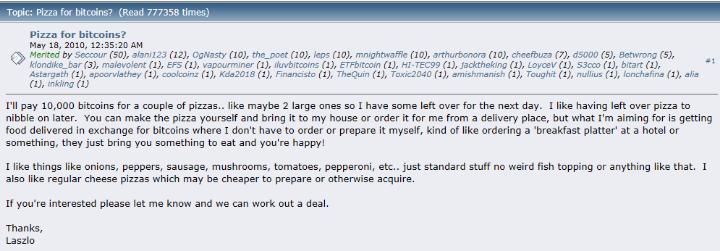 而比特币首次在现实世界中的使用,则要追溯到八年前的五月。2010年5月18日,一位名叫Laszlo Hanyecz的程序员在Bitcoin Forum发帖表示,希望用一万枚比特币(当时价值40美元)换取两份Papa John’s的大披萨。而后在22日密码学爱好者“jercos”,趁商家优惠,花了25美元购买两份披萨寄给Laszlo,并按承诺获得一万枚比特币。