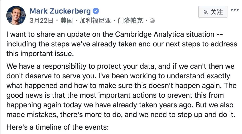 3月21日,在漫长的四天后,Facebook终于打破沉默。扎克伯格发布脸书,回应道“我们有责任保护您的数据,如果我们不能,那么我们不应该为您服务。我一直在努力了解发生了什么事情,以及如何确保这不再发生。” 随后,扎克伯格接受了CNN、纽约时报等媒体的采访。