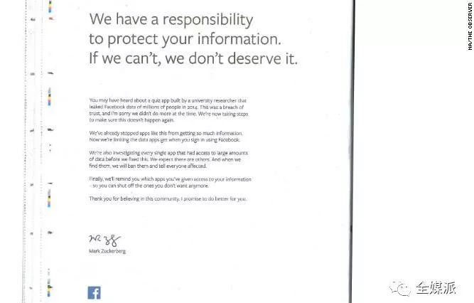 面对继续沸腾的民意。Facebook开始让高管以更高调的方式、更快的频度,回应质疑和进行道歉。3月25日,Facebook在3份美国报纸和英国6份报纸上刊登了致歉广告。这则广告占据报纸整版,采用简单的白底黑字,并附上了扎克伯格的亲笔签名和Facebook的蓝色标志。扎克伯格和桑德伯格开始不断回应媒体同样的提问。