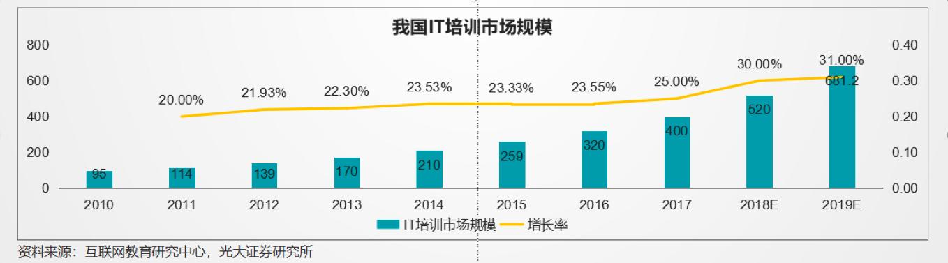 市场对IT技术人员的需求缺口是巨大的。据国家统计局数据显示,2016年IT行业平均工资首次超过金融业排名各行业门类首位。2018年我国IT培训市场规模约为520亿,年均增长将达到30%以上。