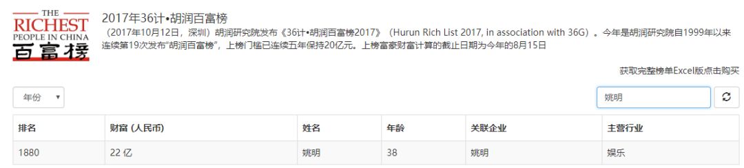 投资领域的成功案例让姚明的财富不断增长,在2017年10月发布的胡润百富榜中,姚明以22亿元人民币的身家跻身榜单,该榜单将姚明的主业归至娱乐业,在体育明星中,姚明仅次于47亿元身价的李宁公司老板李宁。
