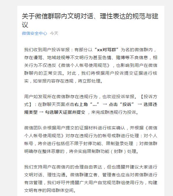 因为群里存在谩骂、地域歧视等不文明行为甚至色情、赌博等不良信息。微信在今天马上就出台相关规定,整治对骂群,明确存整体恶意的将会封群处理。规定如下: