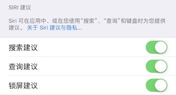 iOS 12 中,在「设置- Siri 与搜索」新增了三个 Siri 建议的选项:搜索建议、查询建议和锁屏建议。Siri 现在可以根据不同场景和 App 提供更丰富的建议。