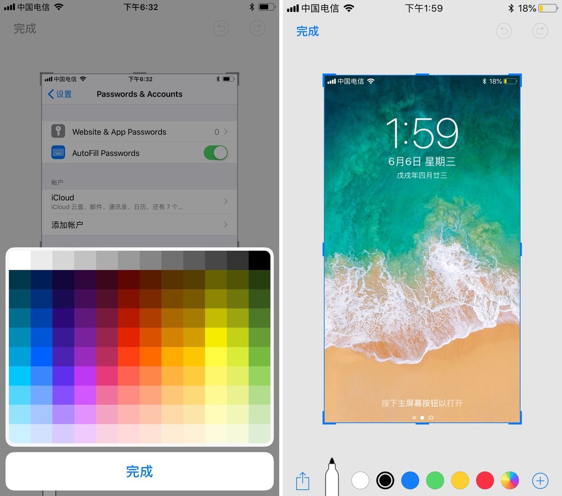 iOS 12 中自带的截图标注功能新增了一个调色板选项,你可以选择使用更多颜色来标注截图、图片和 PDF。