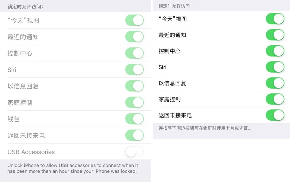 iOS 12 中在「触控 ID 与密码」设置中增添了两个选项开关,现在用户可以选择是否在 iOS 设备锁定时打开「钱包」或接入其他 USB 设备。
