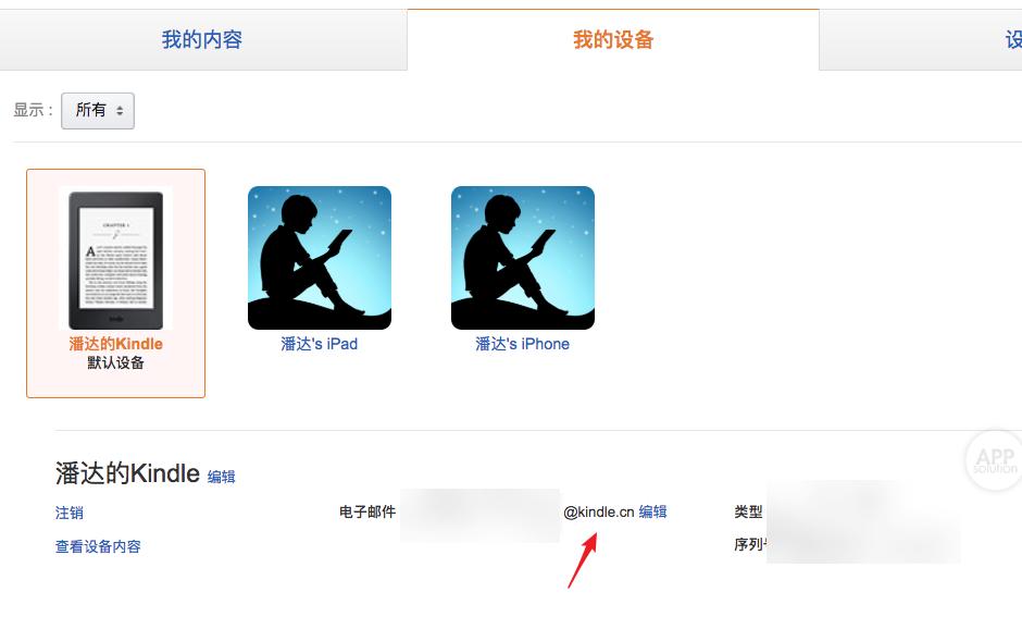 在新页面中点击「我的设备」,选中你的 Kindle,这时候下方会出现一个以「@Kindle.cn」结尾的邮箱,复制这个邮箱地址。
