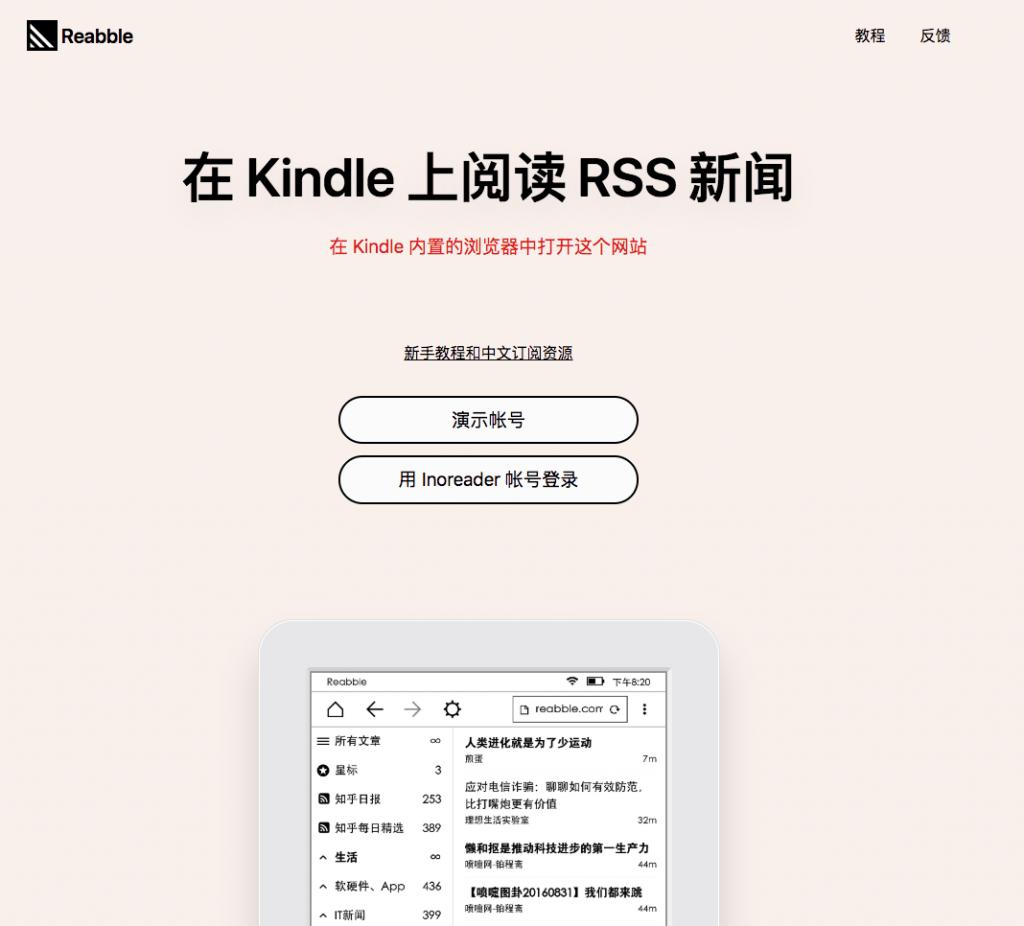 而 Reabble 则和以上服务比较不同,是 Kindle 上的 RSS 阅读器,你需要在 Kindle 的内置浏览器中打开它的网址,并且在 Kindle 联网状态下才能阅读。