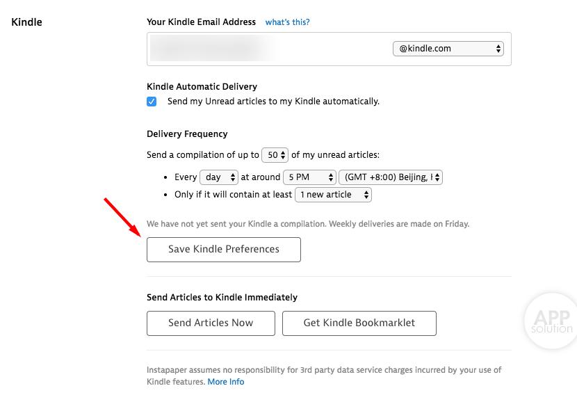 接下来,你需要在新页面中勾选「Send my Unread articles to my Kindle automatically」这一选项,同时你可以设置最多发送的未读文章数量、发送频率、时间等,记得千万不要忘记选择时区,否则推送的时间将会不一致。最后点击「Save Kindle Preferences」,Instapaper 就会按照你的刚刚设置的偏好,自动将保存在其中的文章推送至你的 Kindle 啦。