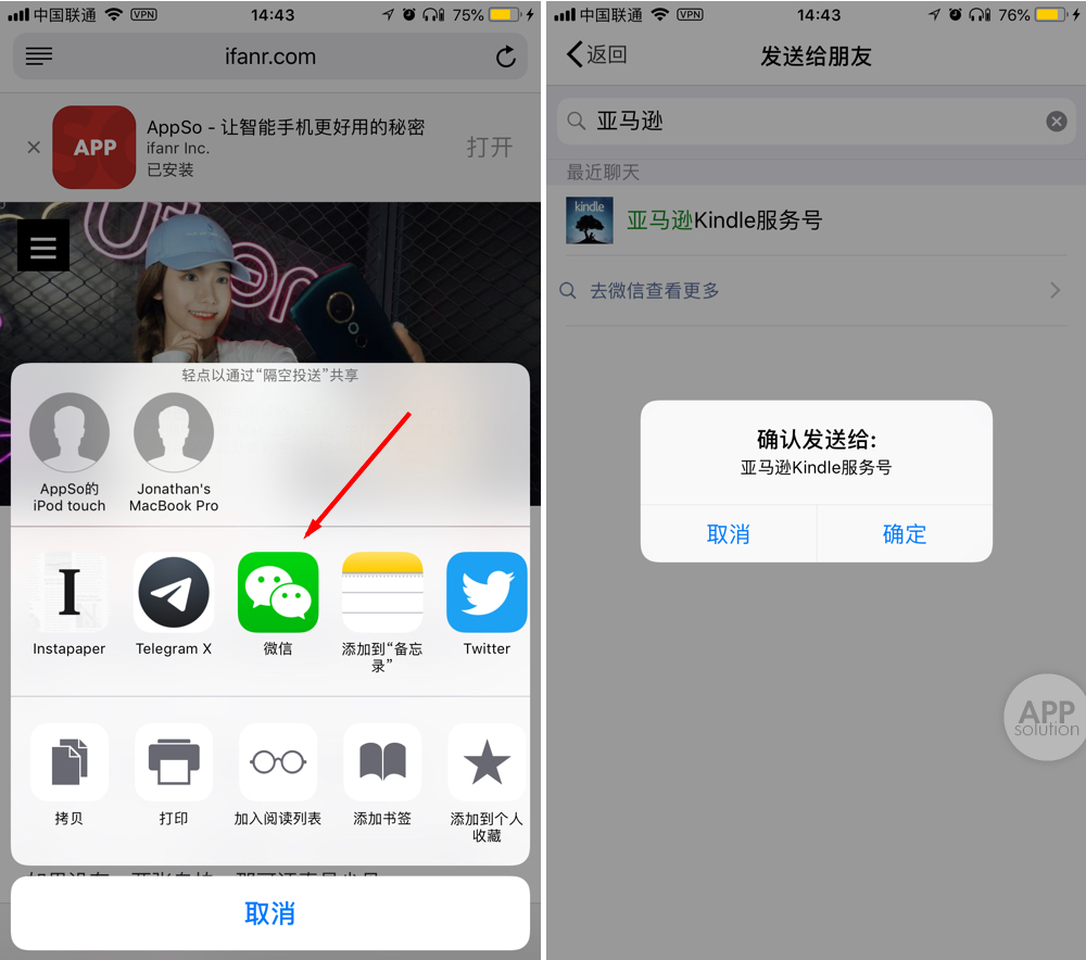 其实,直接在Share Sheet 中点击「微信」-「发送给朋友」,再选中亚马逊服务号,也同样可以将内容推送至 Kindle 中,排版还很好看。