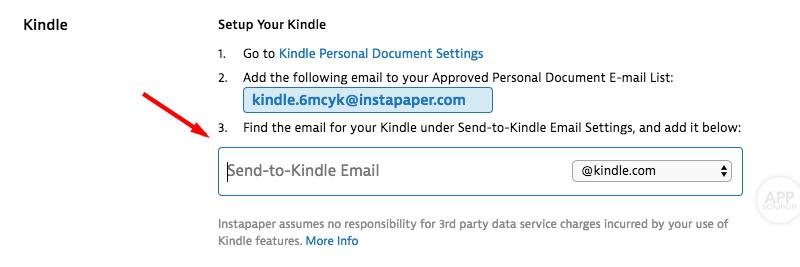 找到 kindle 一栏后,复制 Instapaper 的官方推送邮箱地址,并添加到你的 Kindle 信任邮箱列表里,同时将你的 Kindle 邮箱地址填入,点击保存。
