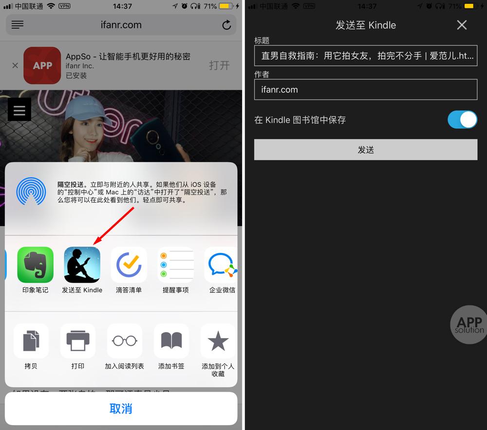 除了微信公众号之外,许多人也会在网页或者 app 中阅读到一些不错文章。考虑到这种情况,Kindle 很早就利用 iOS 的 Share Sheet 做了 Send to Kindle 功能,只要在手机上下载并登陆 Kindle 的 app,就可以通过分享将网页或 app 内容发到 kindle 中。