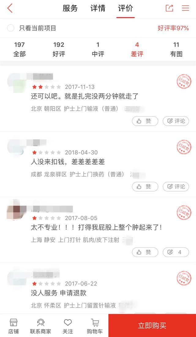 而从结果来看,绝大部分使用过服务的用户还是给出了好评,但也有诸如「不专业,被扎肿了」等差评的声音出现。