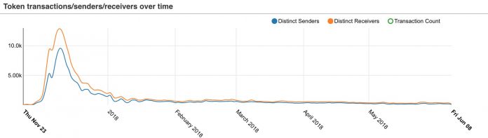 就像在以太坊上交易的ERC20 token一样,加密猫也难以避免市场力量的影响。至今,它的价值相较于历史最高水平已经下降了98.5%。由于加密猫没有固定的价值,这一数据是基于每日活跃用户的数量而非价格。