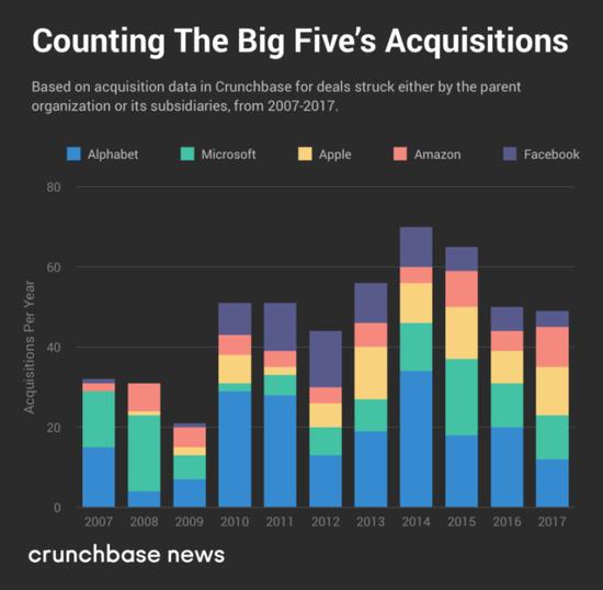 下面的图表显示了2007年至2017年五大巨头成员的收购数量。以美元计算,五大巨头的收购占了重大交易的绝大部分。下面,让我们分别看看每个巨头的并购交易有多大。本文分析主要基于Crunchbase数据,不过这些数据已经与公共来源和监管文件进行了交叉核对。我们将从最有价值(按市值计算)的公司开始。