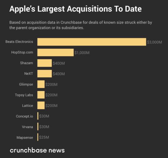 苹果迄今最大的并购交易是斥资30亿美元收购Beats Electronics,后者或许最出名的是其华丽的无线耳机。但吸引苹果眼球的不是耳机,而是其流媒体服务。苹果首席执行官蒂姆·库克(Tim Cook)曾说过,这是“第一个真正正确的订阅服务”。包括Beats的交易,这是我们能够找到的苹果最大并购交易。