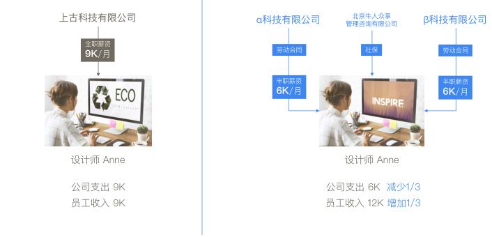 以上图为例,设计师 Anne 全职月薪为 9K,通过牛人众享平台被 A 和 B 两家创业公司同时雇佣,每月可获得两家公司分别支付的 6K+6K 的半职工作薪资。从而 Anne 的每月薪资由 9K 涨到 12K,收入增加了1/3;同时A和B两家公司每月支出由 9K 下降至 6K,减少了1/3。