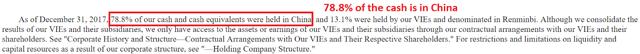 考虑到该公司在开曼群岛注册成立,那么现金是在境外还是在中国境内呢?笔者又仔细研究了一下,发现78.8%的现金在中国: