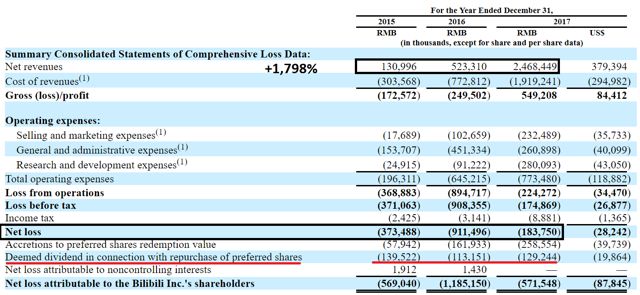 在2017年,利润表亏损了8784.5万美元。但如果公司在未来继续以同样的速度增长,目前的亏损其实也无大碍—— 收入增长对像B站这样处在成长阶段的公司来说更重要。