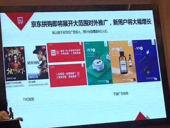 5月初,京东方面对外表示即将大规模推广“京东拼购”,通过TVC、平面广告实现线上、线下全方位广告投放,预计全国覆盖6亿人次,预计新用户将大幅增长。